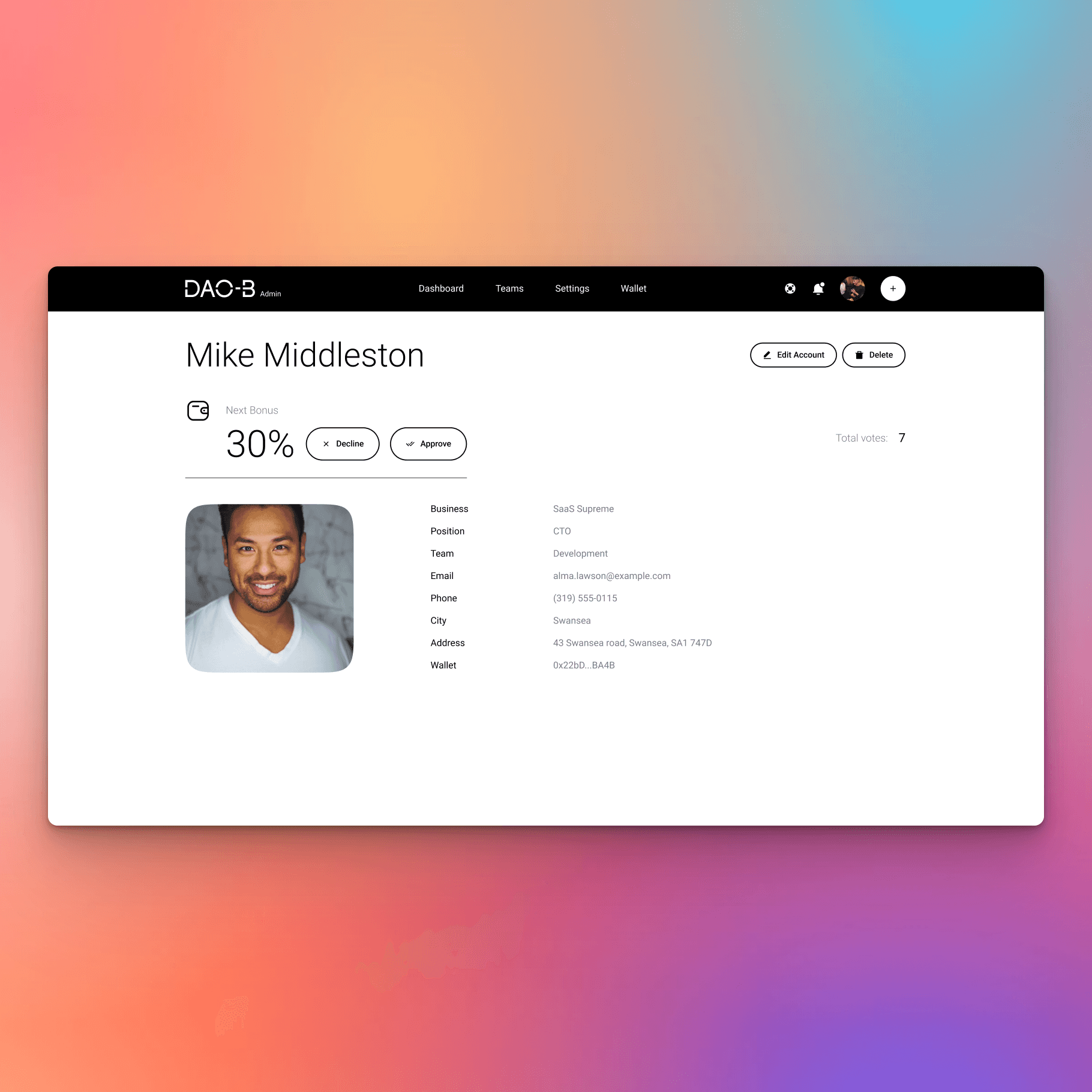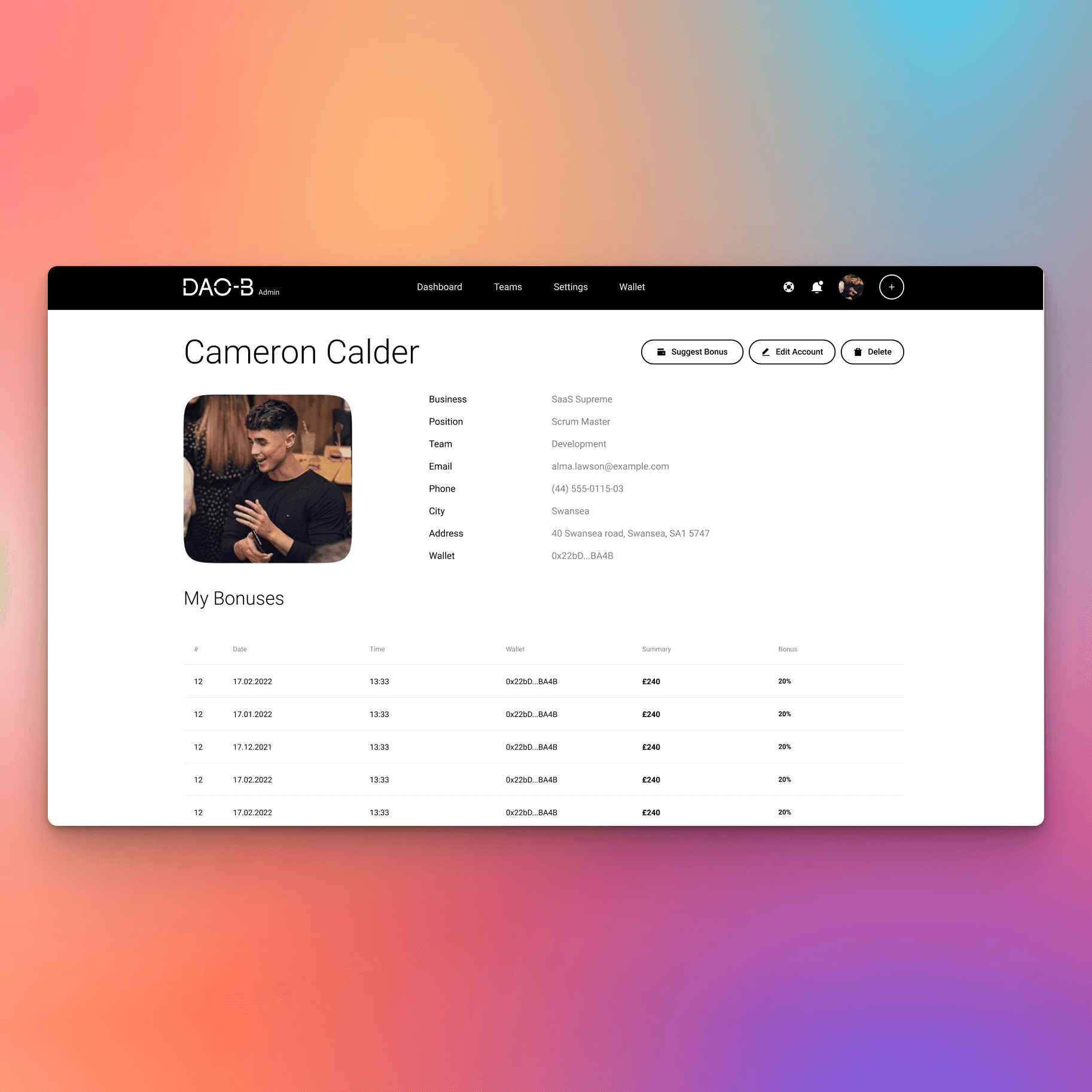 DAO-B is a decentralised voting platform concept I designed to explore equitable reward distribution in start-ups and Web3 teams. Centred around a connected wallet, it allows teams to vote anonymously (or publicly) on each member’s contribution, triggering automated bonus distribution via smart contracts. With flexible intervals and transparent scoring, DAO-B was created to help early-stage businesses incentivise participation fairly, without needing large cash reserves or manual oversight.
